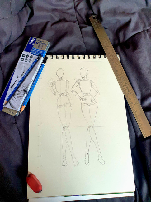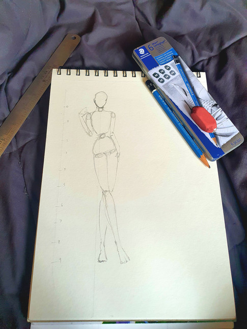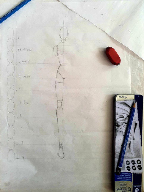 Like mentioned above, to curate fashion figures usually 9 head or the 10 head technique is used. Sometimes it can go up to even 11 heads but in the industry the widely used method is the 9 or 10 heads. Before starting, another thing to note is, one can get started off by practicing first on newsprint or butter paper instead of directly sketching on paper. This will help us gain confidence. There is also no harm in starting on paper, if you are comfortable with sketching on paper then go ahead and do so! Now let's look into how exactly the figures are drawn by following certain steps shall we?