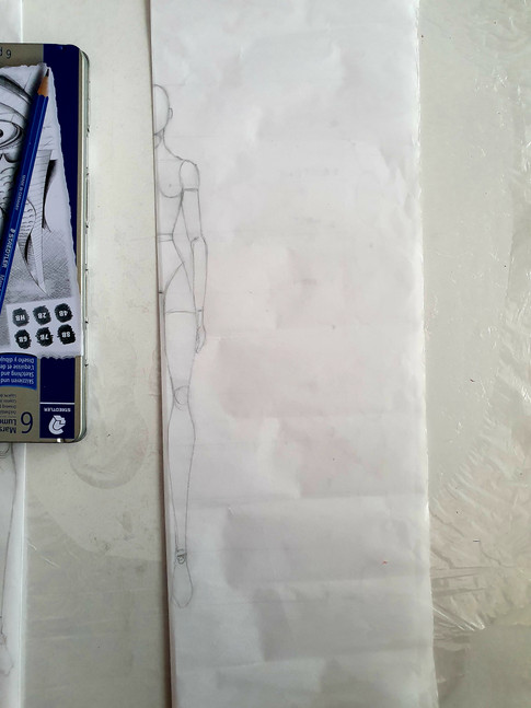 1.Firstly we get started by making 9 heads so we don't go wrong with the proportion. Keeping in mind the posture we are going to create block figures representing that pose in 9 heads. We will be drawing not one but two figures in a page to establish a relationship between the two. As I have mentioned in my previous posts, It is very important to establish relationships between the sketches to add depth and emotions.
