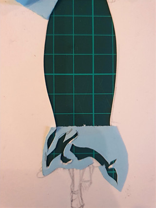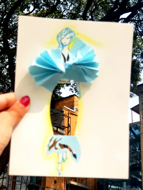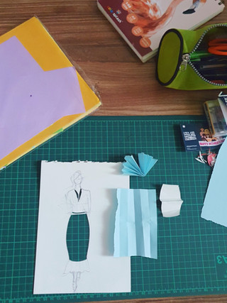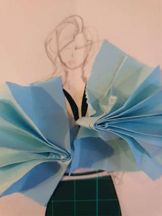 For my fourth exploration I decided to use paper folding along with cutting technique and found interesting garment formation. I also enjoyed using a young blue colour for this exploration which adds a sort of bubbliness to the exploration.