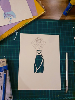 Working on my third cut out and this time I decided to make garments with interesting cuts and so I did not just limit myself to white paper. As you can see the leaf cut out had torn but instead of getting disheartened I found another way to use it.