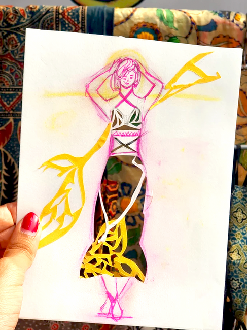 In this exploration, I cut out the entire silhouette and placed it on a popping orange paper. I also found floral prints on a newspaper which I placed behind the cut outs. Playing with the foreground is equally important so I cut out flower shapes from a tissue and arranged it like an A-line skirt. The analogous colours of green and orange play out like a warm ray of hope thereby adding freshness to the exploration.